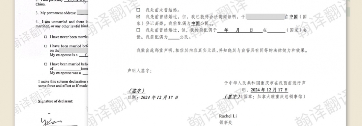 成都翰译翻译公司作为专业的涉外文件翻译服务机构,在处理加拿大单身证明翻译方面具有丰富经验。无论您有紧急任务还是常规业务需求,我们都能够提供优质专业的服务,确保您的跨国事务办理顺利高效。如果您有加拿大单身证明翻译或其他涉外文件翻译需求,欢迎联系我们的专业团队。