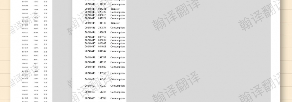 - 专业金融术语的规范使用:银行流水中包含“存款”、“取款”、“利息”、“手续费”等特定金融术语。翻译时必须使用国际通用的标准英文金融词汇,确保含义精准,避免歧义。