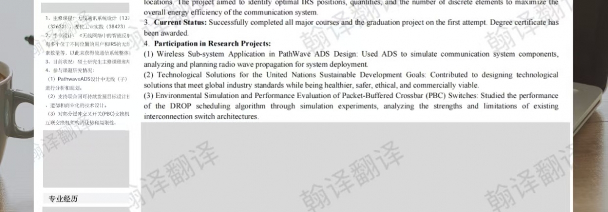 今天,成都翰译翻译公司完成了一份简历的中译英翻译任务。这份简历的主人是一位希望在国际市场上寻找职业机会的求职者。通过这个案例,我们深刻体会到,简历翻译看似简单,实则需要高度专业性与细致入微的处理。作为一家专业的翻译机构,我们始终以严谨和专注的态度对待每一份简历,因为我们深知其对于求职者职业发展的重要性。