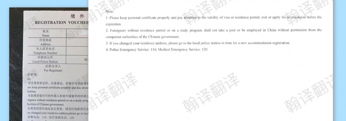 - 注意事项的完整传达:凭证下方通常附有重要的“注意事项”,涉及证件保管、签证有效期、在华就业限制、住址变更后须重新登记等关乎境外人员合法居留的关键规则。我们的译员对这些条款进行了精确、清晰的翻译,确保持证人能够充分理解并遵守中国的相关法律法规,明确自身的权利与义务。