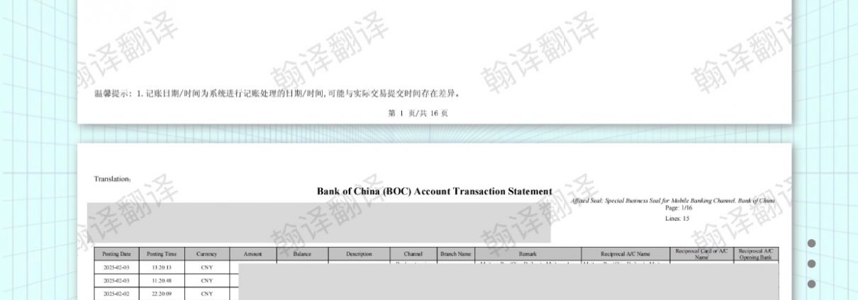 A:您需要提供银行流水的清晰电子版(如PDF扫描件或高清照片)。为确保翻译准确,请确保文件上的所有文字、数字、银行印章及交易明细均清晰可辨。