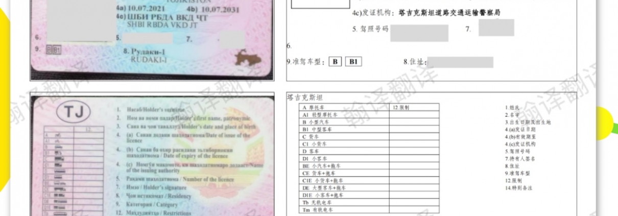 - 准驾车型规范转换:塔吉克斯坦驾照上的准驾车型代码与国内分类不同,译员需要根据国际通用标准及国内对应关系,进行准确转换和注释,确保车管所能够清晰识别。
