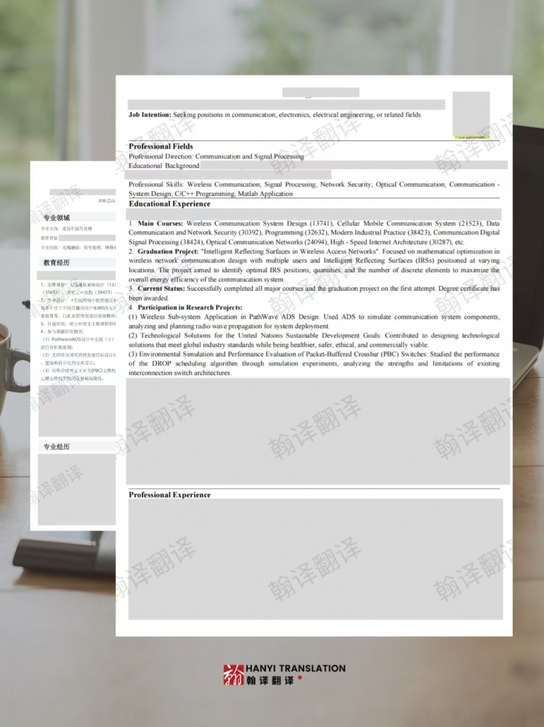 今天,成都翰译翻译公司完成了一份简历的中译英翻译任务。这份简历的主人是一位希望在国际市场上寻找职业机会的求职者。通过这个案例,我们深刻体会到,简历翻译看似简单,实则需要高度专业性与细致入微的处理。作为一家专业的翻译机构,我们始终以严谨和专注的态度对待每一份简历,因为我们深知其对于求职者职业发展的重要性。