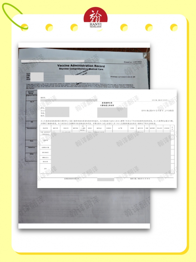 A:需要疫苗接种记录清晰扫描件及个人信息。成都翰译翻译公司建议提供完整的记录信息。