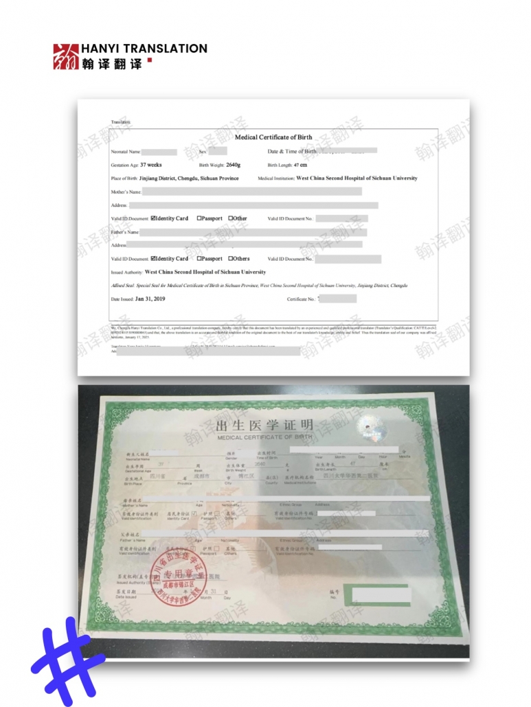 在中国出生的孩子,其出生医学证明是记录个人出生信息的关键文件,包含了婴儿的姓名、性别、出生日期、出生地点以及父母信息等重要内容。当涉及到签证申请、移民手续、海外教育或跨国婚姻登记等跨国事务时,相关机构往往要求提供该文件的专业翻译版本。成都翰译翻译公司提醒您,即使孩子在中国出生并获得了中国的出生证明,在办理各类跨国事务时,仍然需要提供符合要求的翻译版本,以确保证明文件被顺利接受。