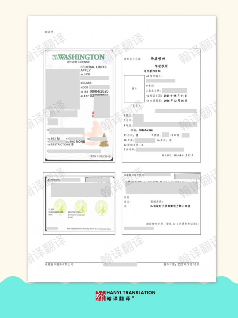 如果您有美国各州驾照、其他国家驾照或其他各类证件的翻译需求,欢迎随时联系我们。成都翰译翻译公司将以专业、严谨的服务,为您解决翻译难题,确保您的跨国出行和事务办理顺畅无忧。